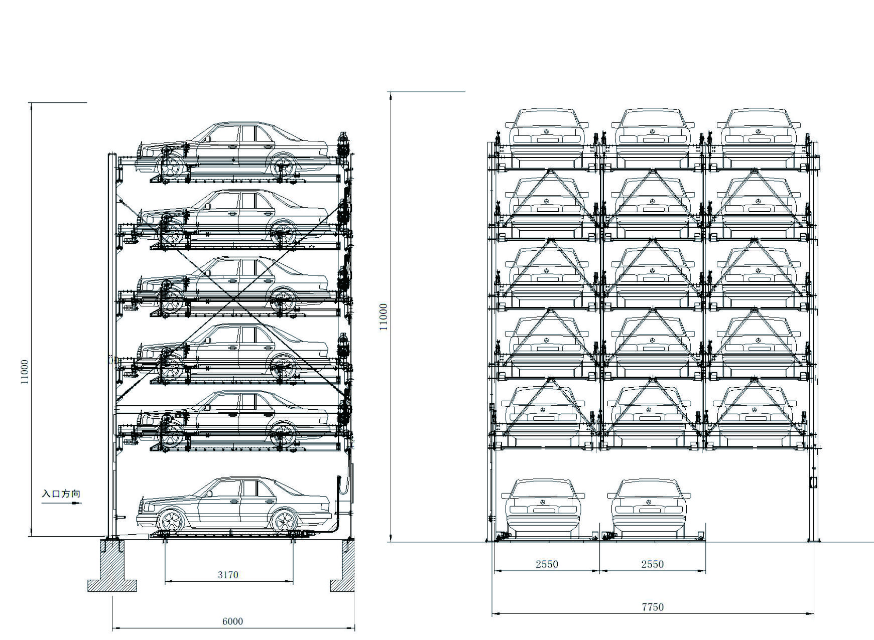 頂層載車板上下升降,底層載車板左右橫移,中間各層載車板既可上下升降,亦可左右橫移,通過PLC自動(dòng)控制,完成存取車過程。